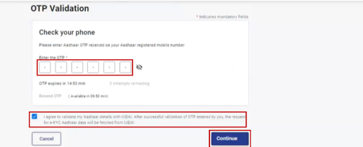 Step 4: OTP వెరిఫికేషన్ పేజీ చూపించబడుతుంది. Terms and Conditions కు టిక్ చేసి “Continue” పై క్లిక్ చేయండి.