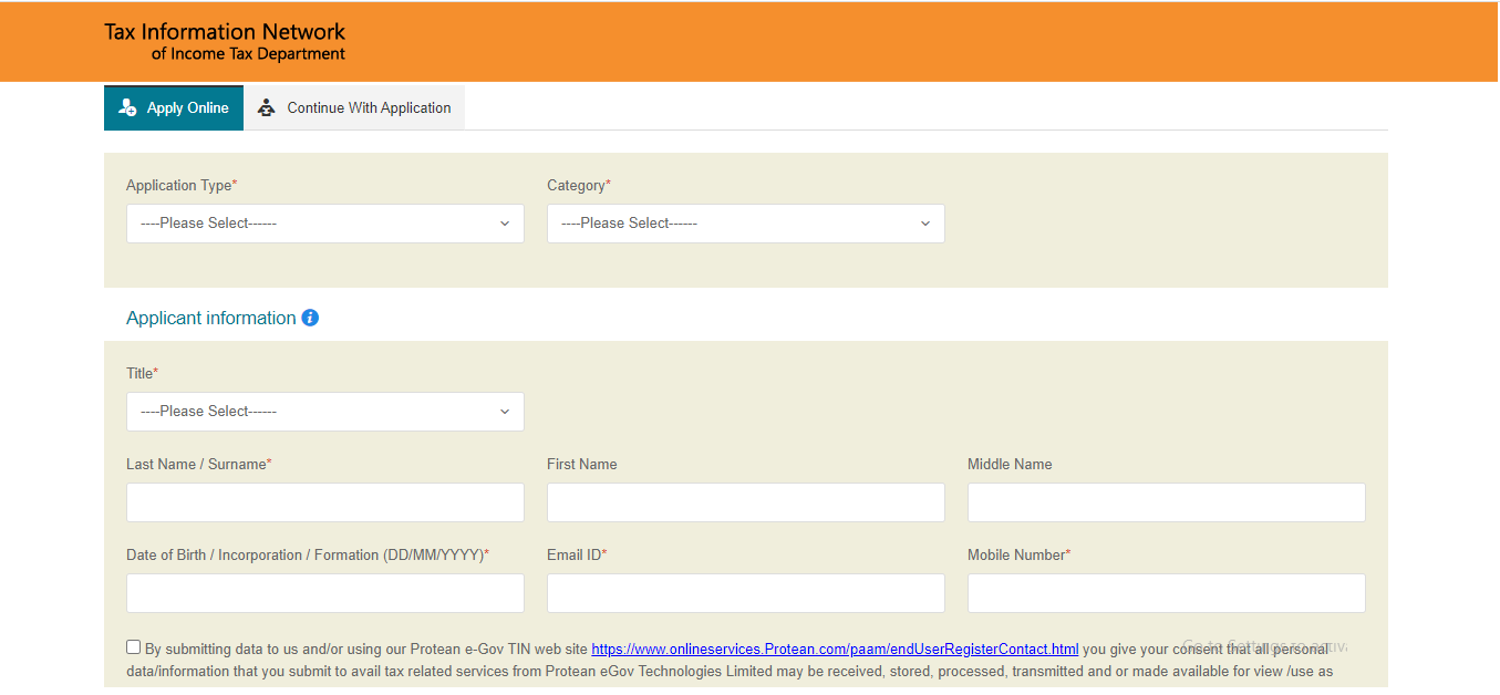 అక్కడ ఉన్న “Continue with PAN Application Form” బటన్ను క్లిక్ చేసి దరఖాస్తు ఫారమ్కి వెళ్లండి.